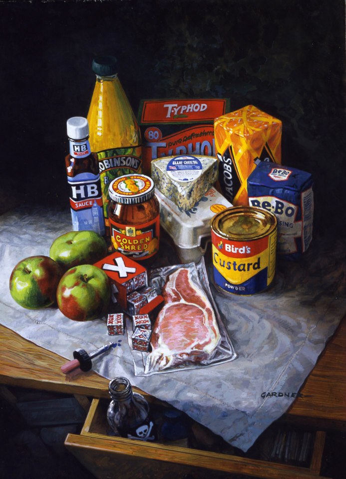 < > This is one of the few paintings of mine I have up on the wall. It was a book cover for Harlequin. The story was set in England and was about a food poisoner. Some people might say English food is poison, but that's another story.