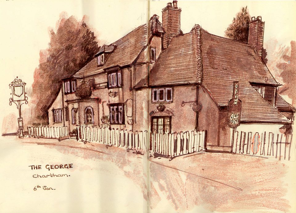 < > This is The George in Chartham, Kent, a brief stroll from where my parents live. One of three pubs in the village, and a beautiful old building. Drawing is such thirsty work.Chartham, Kent, England